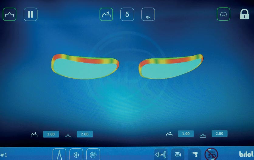 Uz 3D virtualni prikaz vidi se veoma precizno kako staklo treba da bude ugrađeno u okvir i ukoliko želite možete izvršiti izmene pozicija i zakrivljenosti fazete bez ikakve štete na staklu koje svakako još nije ni obrađeno. Uz sve to Briot Couture na aparatu za brušenje stakla nudi još i kosu fazetu koja dodatno olakšava ugradnju velikih dioptrija u sve tipove okvira.