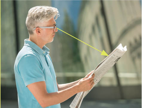 Digital Inside™ Technology Progresivno sočivo optimizovano za čitanje štampanih i digitalnih medija: Zona za blizinu proširena je vertikalno i horizontalno za obe udaljenosti čitanja - uobičajenih štampanih medija i digitalnih uređaja. Rezultat: opušten i prirodan položaj glave i tela. |