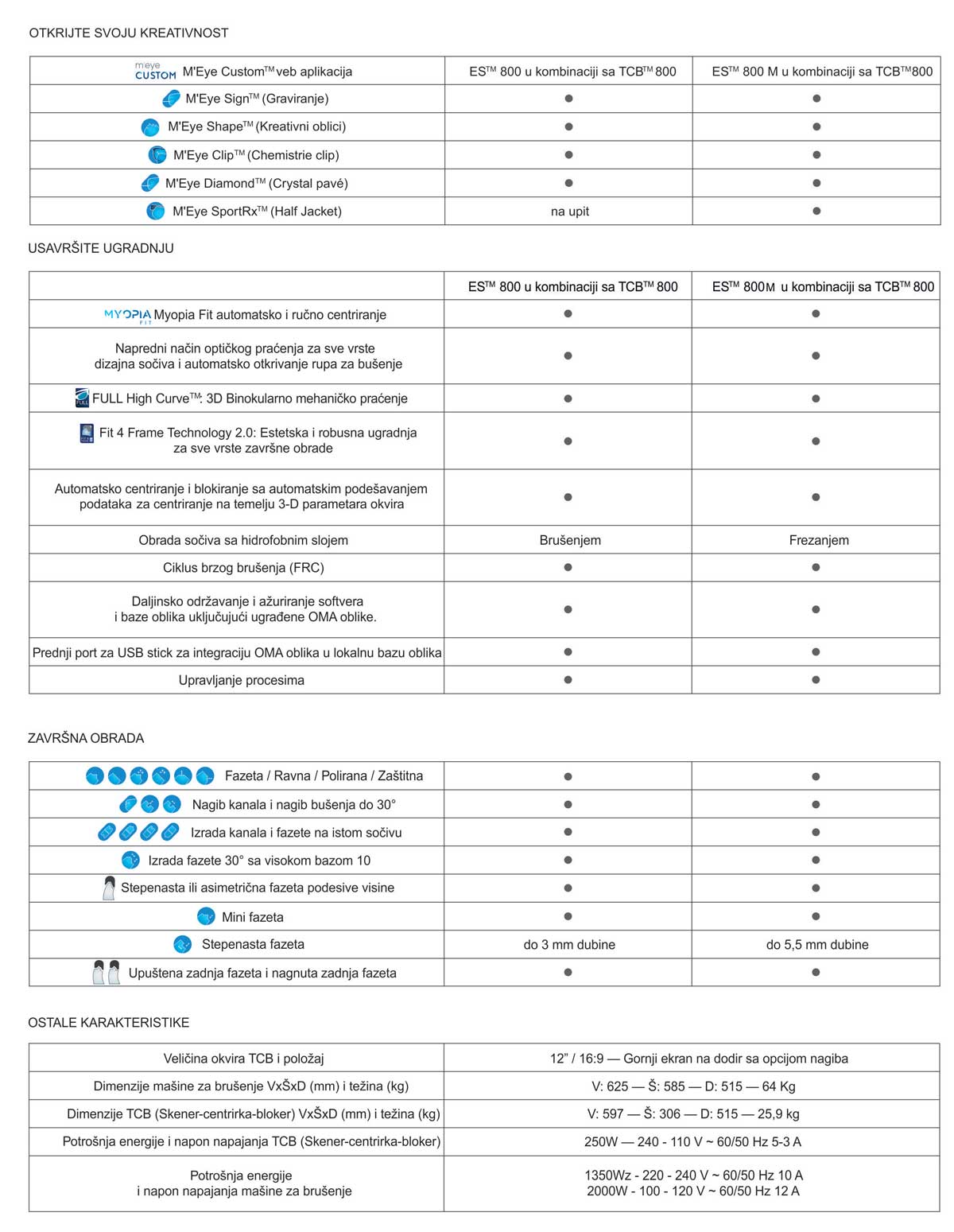 ESTM 800 kompaktan je i jednostavan sistem za završnu obradu, sastavljen od sistema za brušenje ES™ 800 i automatskog sistema za obeležavanje, centriranje i blokiranje TCB™ 800. Hibridna verzija, ES™ 800M, koja kombinuje freziranje i brušenje, obezbeđuje brušenje klizavih ili osetljivih sočiva i sprečava rizik od odstupanja ose.