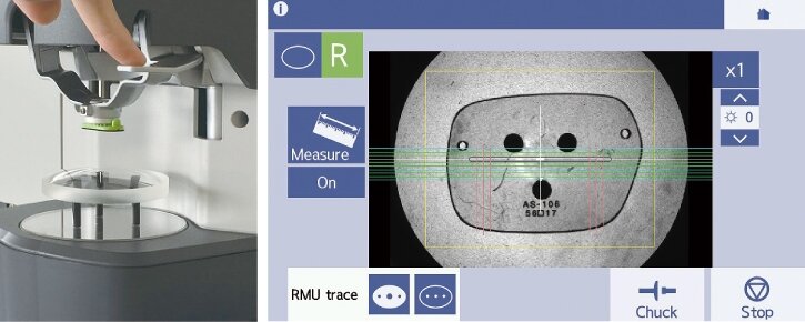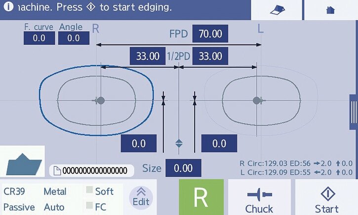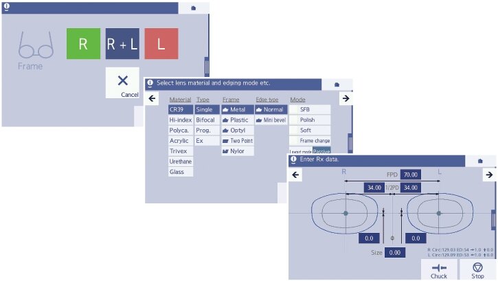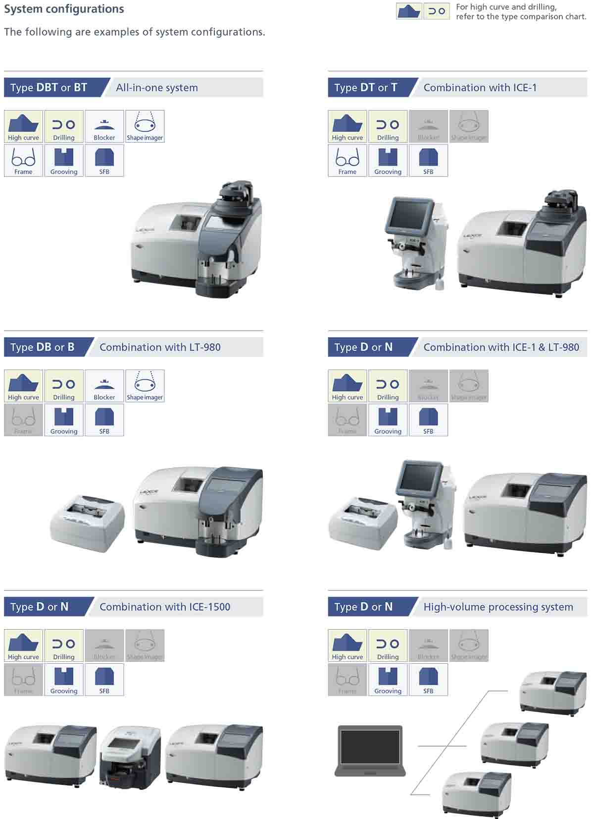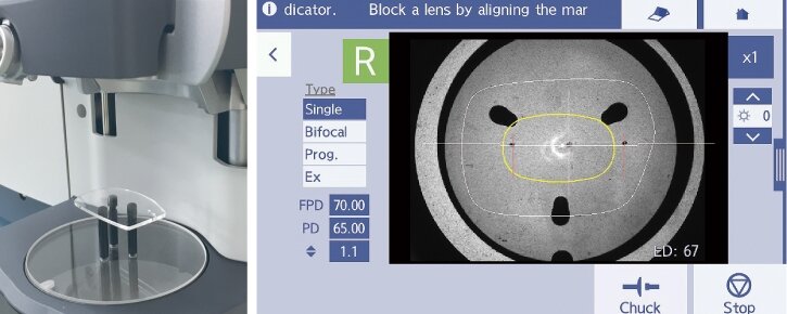 Bloker odlikuje visoka preciznost prilikom blokiranja uz jednostavnost rukovanja. Inteligentni bloker je u sklopu uređaja i pomoću kamere na displeju prikazuje obeležena mesta. Čak i kod sočiva sa visokim cilindrom ili prizmom operater može precizno izvršiti blokiranje. Na displeju je prikaz sočiva sa preciznim podacima o obliku i bušenjima. Precizan 3D trejser za sve tipove okvira ima funkciju automatskog fiksiranja i mogućnost postavljanja u prirodnom položaju. Obezbeđeno je precizno blokiranje i praćenje šablona okvira, čak i kod jako zakrivljenih okvira. Visoko kvalitetna završna obrada, obaranje ivica, izrada fazeta i bušenje, izvodi se pomoću različitih brusnih ploča za obradu i poliranje, kao i 5 vrsta bušilica.