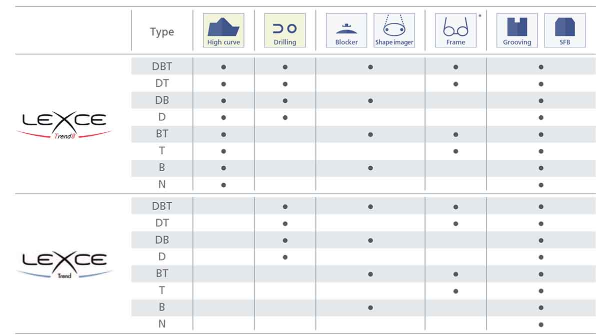 Na kraju želimo još da istaknemo da verzija Trend 8 je optimizovana za brušenje sočiva sa visokom baznom zakrivljenosti (najčešće je reč o ugradnji dioptrijskih sočiva u sunčane okvire). Posebno dizanirane brusne ploče će omogućiti pravljenje specijalnih fazeta, a sve u cilju kvalitetnog ugrađivanja sočiva u najzahtevnije konstrukcije okvira.