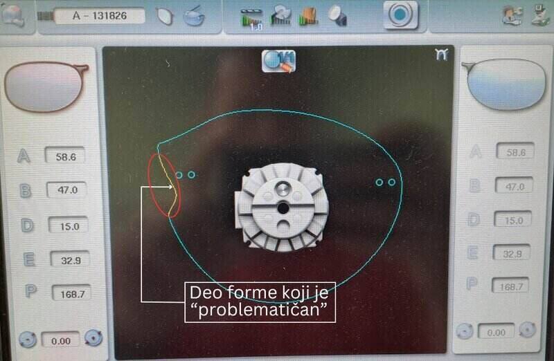 U konkretnom slučaju za obradu smo koristili Essilor MR Blue 2.0. Na slici koja sledi možete i da vidite koji deo sočiva je sporan. Sama mašina u navedenom slučaju upozorava na to, i taj deo ivice sočiva je na displeju obojen drugom bojom. Takođe treba istaći da će očitavanje ovakvih formi biti preciznije ukoliko koristite optičko očitavanje. Naravno pojedine oblike uopšte nećete moći sa standarnim mehaničkim trejserom ni očitati. Idealno bi bilo da od proizvođača naočara dobijete formu u digitalnom formatu, takozvanom OMA formatu.