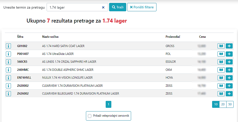 Evo jedan primer iz prakse. Za samo par sekundi dobijate kompletnu ponudu svih lagerskih sočiva u indeksu 1.74. Korisno, zar ne.