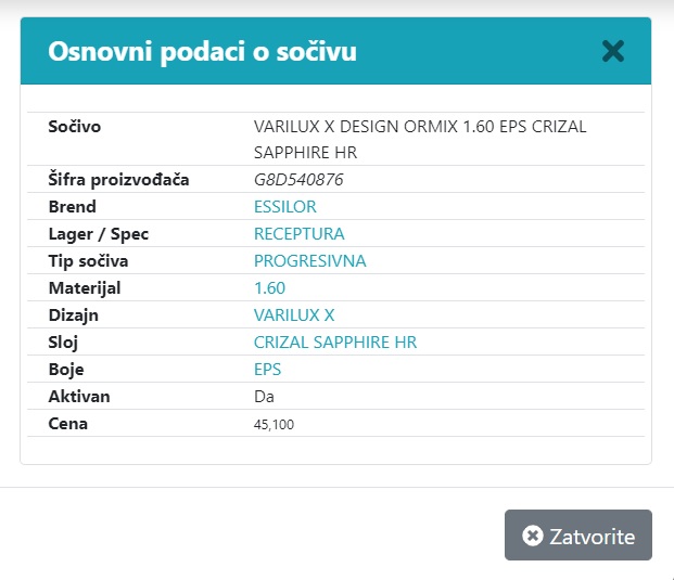 Pronalaženje konkretnog sočiva u okviru aplikacije OnlineOptika je jako jednostavno. Kada ste izabrali konkretno sočivo klikom na "i" (nalazi se sa desne strane naziva sočiva dobijamo detaljnu specifikaciju sočiva.