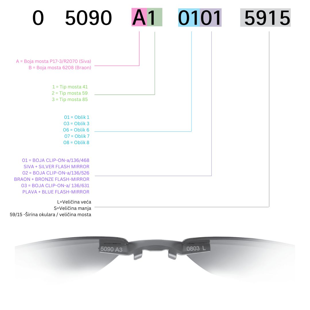 Oznake se nalaze mostu (vidljive su sa gornje strane) i deo oznaka se nalazi na mostu na desnom, a deo na levom okularu. Na levom okularu se nalazi oznaka 5090 koja zapravo označava tip Clip-On-a (Syle Shades). Pored ove oznake imamo i oznaku boje mosta i oznaku tipa mosta. U primeru sa slike je reč o oznaci A3. Dakle, reč je o Clip-On-u koji ima sivu boju mosta (A) tipa 3 koji odgovara mostu sa Silhouetet naočara sa oznakom MST 965.