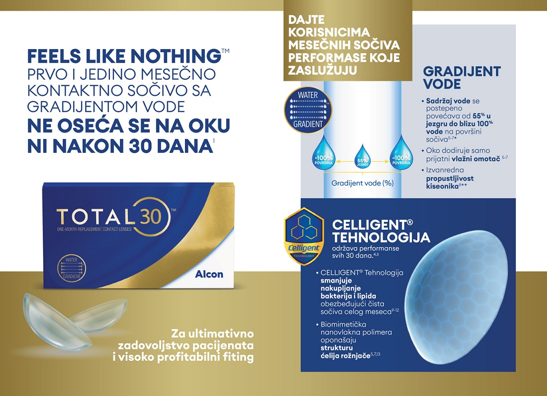 TOTAL30® su jedina mesečna sočiva na svetu čiji je materijal takav da ima gradijent vode i klinički je dokazano da se uopšte ne osećaju na oku čak ni posle 30 dana nošenja, održavanja i čuvanja.