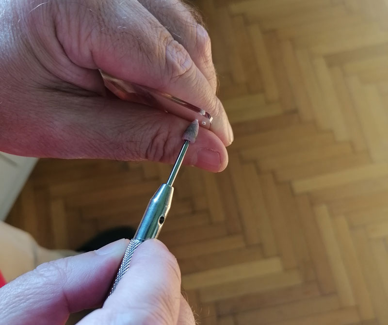 I na kraju bi još podelili par saveta. Uvek oborite ivicu i sa prednje i sa zadnje strane sočiva. Takođe oborite ivice i rupa (na sledećoj slici vam pokazujemo alata sa kojim je to moguće uraditi). Ako se naočare montiraju sa šrafovima uz sočivo stavite prvo plastičnu podlošku, pa preko nje metalnu šajbnu i na kraju maticu. Takođe je dobro da se stavi premaz koji će sprečiti lako odvrtanje matice. Na kraju šrafa takođe možete da stavite metalnu ili plastičnu kapicu. Ako je šraf prevelik predlažemo da ga skratite, ali vodite računa da ne preterate, jer je moguće da će se u isti okvir ponovo ugrađivati sočiva sa većom dioptrijom i onda imate problem, jer nećete moći zašrafiti maticu.