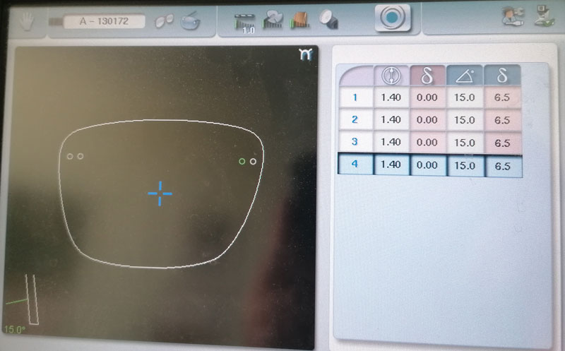 Sočivo koje se ugrađuje ima bazu 2,5. Dakle, ovde nije velika razlika u dve baze, ali je ipak bilo neophodno povećati ugao bušenje. Mašine za brušenje stakala (u konkretnom slučaju Essilor Mr Blue 2.0) vam dozvoljavaju da možete da birate željeni ugao bušenja. U ovom slučaju smo korigovali (povećali) ugao bušenja (povećali smo za 6,5 stepeni, sa 8,5 na 15 stepeni)