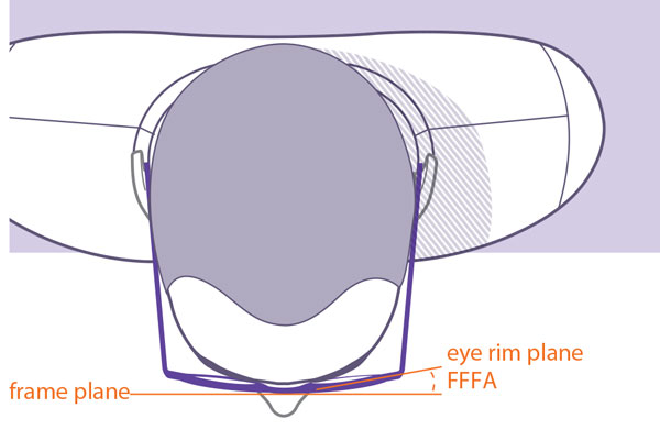 Jedno od rešenja je da se sočivo radi u bazi, tj da baza sočiva koje se ugrađuje u ram ima istu vrednost kao baza demo stakla. Ovo može da poskupi sočiva jer se ovakvo sočivo isključivo radi kao receptura. Povećanje baze može uticati i na debljinu sočiva (ne nužno spoljašnje ivice, ali je to posebna tema i nadam se da ćemo o tome pisati u nekom od narednih tekstova). Slika koja sledi pokazuje vam izgled montiranih naočara bez i sa specijanom bazom. Ovde treba istaći da pored loše estetike, klijent može da ima i optičke smetnje ukoliko wrap ugao puno odstupa od svog prirodnog položaja. Plava linija prikazuje prirodnu poziciju naočara. Takođe zaključujemo da se u navedenom primeru radi o minus dioptriji.