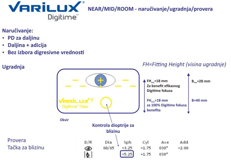 - Varilux Digitime Room sočiva, digresija će biti 1.50, a tačka jasnog vida u beskonačnosti ( U ovakvoj kombinaciji adicije, Varilux Digitime se ponaša kao standardan progresiv). Kada na fokometru budete očitavali vrednost dioptrije, vi ćete u kružiću koji označava kontrolnu tačku dioptrije za blizinu, očitati dioptriju +3.50, a u krstiću imaćete vrednost +2.00 (+3.50-1.50=+2.00).