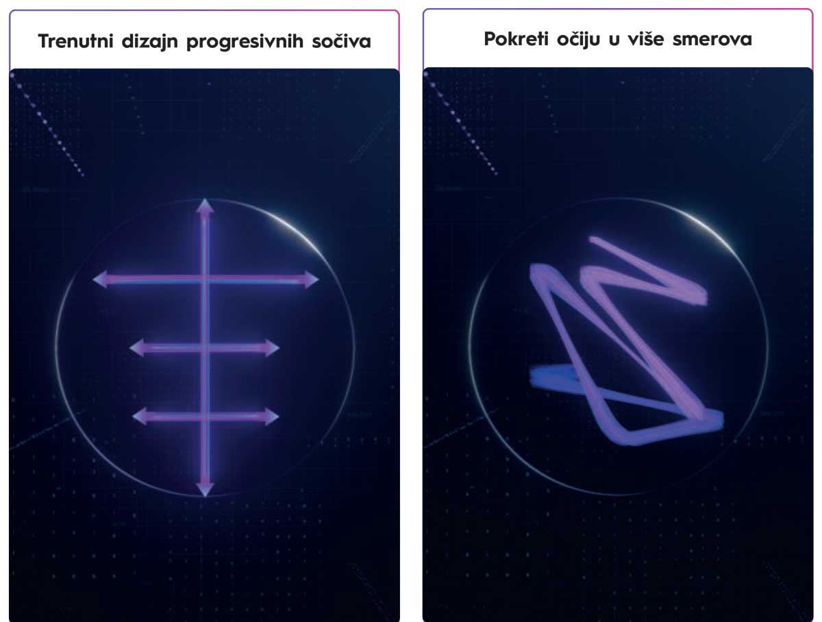 Trenutni progresivni dizajn sočiva ima linearnu koncepciju, ali pokreti očiju su u više smerova: to može da natera oči da ulože dodatni napor kada brzo menjaju pogled.