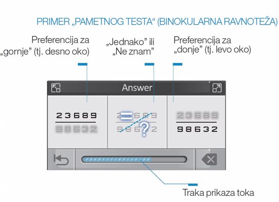 Pacijent sada ima mogućnost da se izjasni da „ne primećuje razliku“ ili da „ne zna koja je mogućnost bolja“. Pametni testovi upotrebljavaju te informacije kako bi dali precizne rezultate. Nema više pogađanja, a poverenje pacijenta je povraćeno.