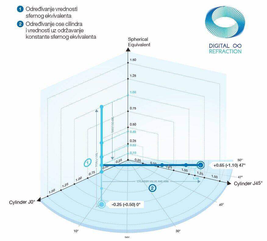 Ova inovacija omogućuje brz i direktan metod refrakcije: digitalnu beskonačnu refrakcijuTM. Kontinuirana kompenzacija na sferi, cilindru i osi obezbeđuje preciznost jer se odgovori zasnivaju na kompenzovanim dioptrijama, čime se eliminiše potreba za procenjenom kompenzacijom sočiva.