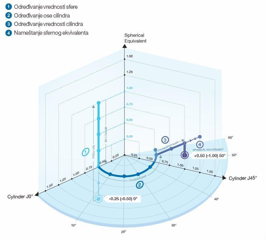 Tradicionalno, stručnjaci za pregled vida rezultat postižu individualnim određivanjem sfere, cilindra i ose, iako te tri dimenzije utiču jedna na drugu. To zahteva ponovnu proveru vrednosti ponavljanjem procesa kako bi se dobio precizan rezultat. Stručnjak za pregled vida takođe mora da kompenzuje dodatu sferu i da zatim proceni konačan rezultat.
