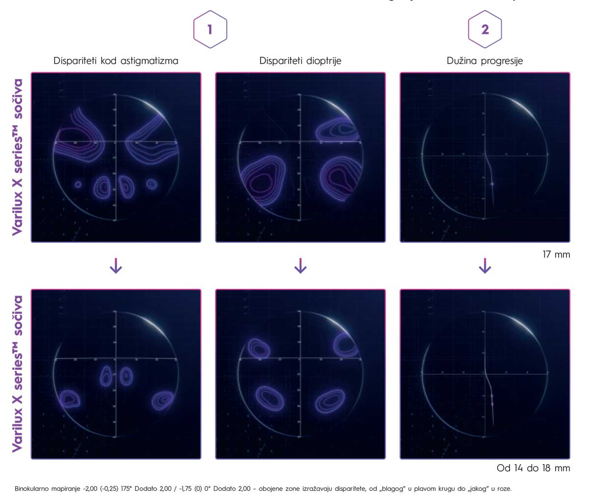 - Podignite binokularni vid na viši nivo. Optimizacija svake fokusne tačke sočiva smanjenjem optičkog dispariteta između dva sočiva. Zahvaljujući ovome, ova binokularna optimizacija zasnovana na individualnom režimu gledanja nudi visoku oštrinu vida kad god je to potrebno. Dispariteti su razlika optičkih podešavanja između dva oka, za isti vizuelni cilj, i mogu da uspore pokrete očiju. Pored uzimanja u obzir recepta za dva oka za dizajniranje jednog sočiva, profil vizuelnog ponašanja omogućava optimizaciju svake fokusne tačke sočiva smanjenjem optičkih dispariteta između dva sočiva. Kao rezultat toga, ova binokularna optimizacija zasnovana na ponašanju nudi visoku oštrinu vida gde god je pacijentu potrebna.