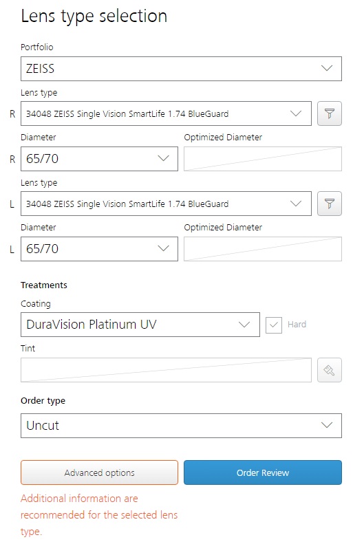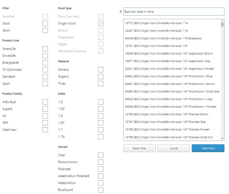 Ovde je zaista sve savršeno napravljeno. Snalaženje je jednostavno, logično i razumljivo, tako da vrlo brzo dolazimo do željenog sočiva. Jedina stvar, koja bi čini mi se, i ovako dobru aplikaciju poboljšala je to da imamo i filter "receptura". Naime imamo filter lager (Stock) i te prozvode prepoznajete tako što u nazivu imaju reč Finished (evo jednog primera :34385 ZEISS Finished SV ClearView 1.67 BlueGuard DuraVision Platinum UV). Iz navedenom ukazujemo da treba da vodite računa da ne poručite lager ako ste želeli recepturu, a jedini način je da pratite da li se u nazivu pojavljuje reč Finished. Izbor slojeva, boja kao i dodatne optimizacije teku glatko i zaista sve pohvale za kreatore aplikacije.
