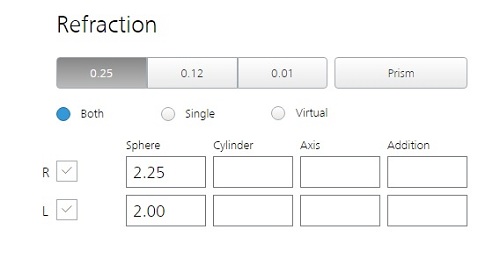 Polje Both i Single nam pokazuje da li poručujemo sočiva za oba ili samo za jedno oko, a Virtual koristimo kada poručujemo jedno recepturno sočivo, ali je neophodno da upišemo oba sočiva, stim što označimo samo ono koje se poručuje. Najčešće koristimo Both i to je polje koje je u startu označeno.